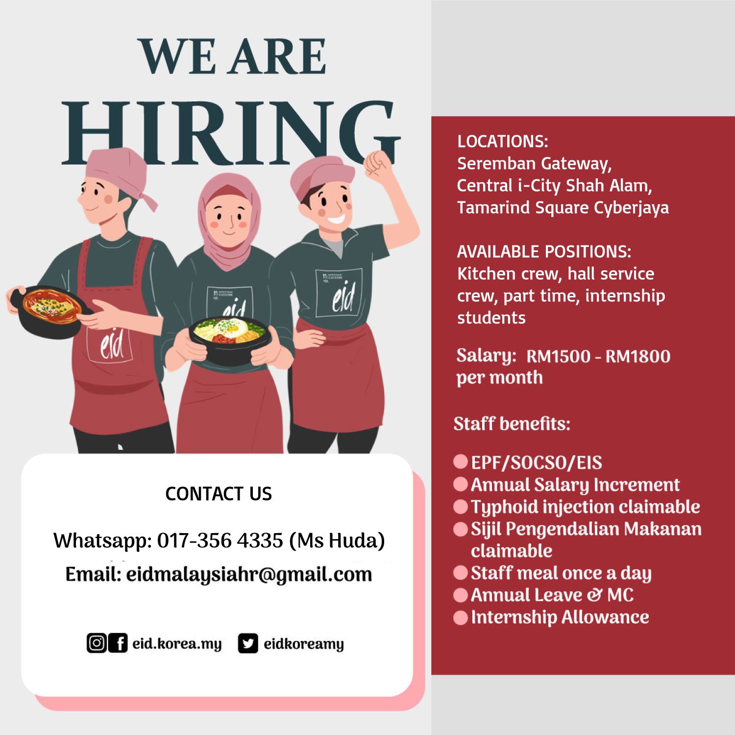 Uzivatel Eid Authentic Korean Cuisine Na Twitteru Helprt Jawatan Kosong We Are Hiring Available Positions Seremban Full Time Kitchen Crew Part Time Kitchen Helper Cyberjaya Full Time Kitchen Crew